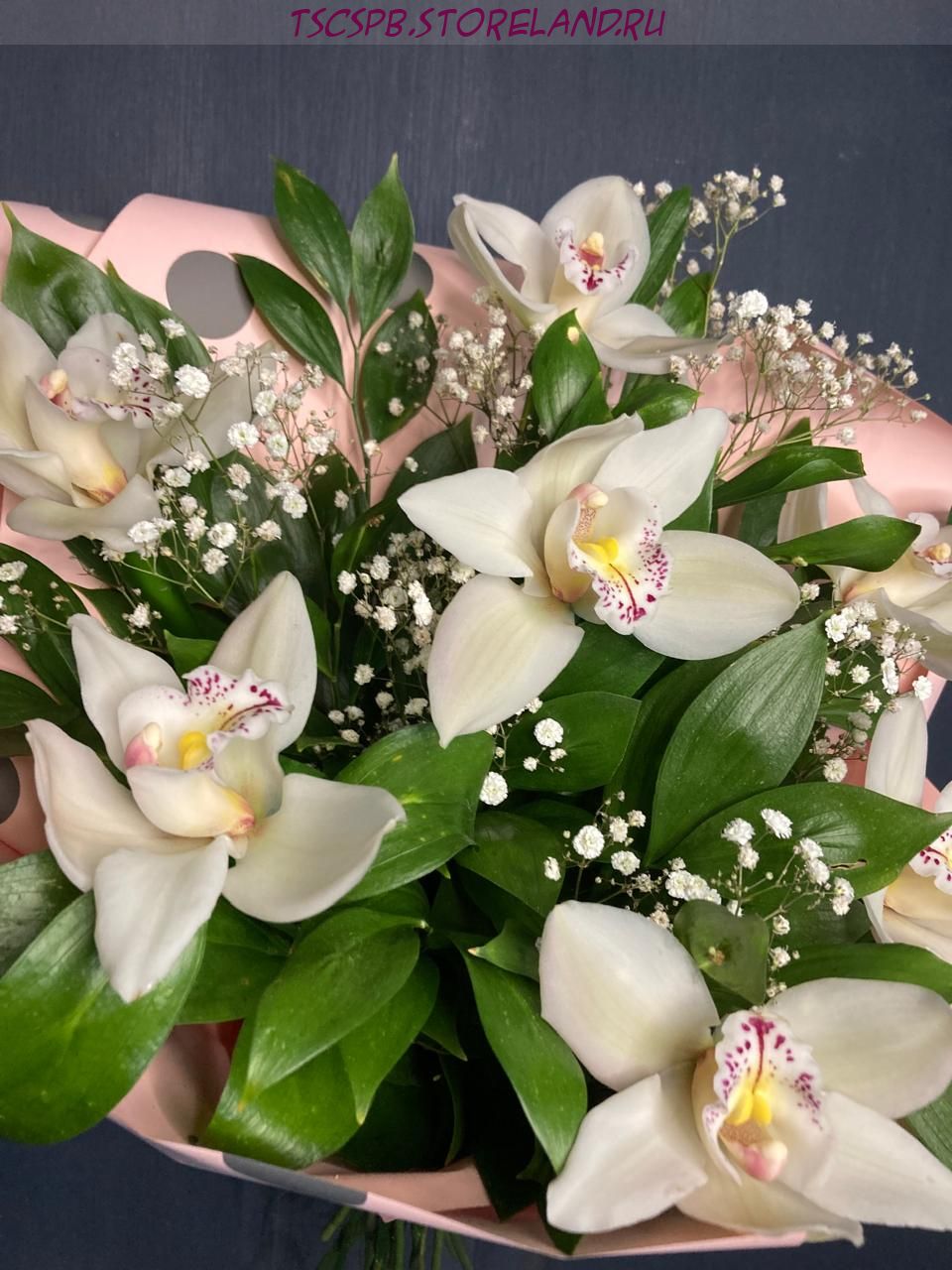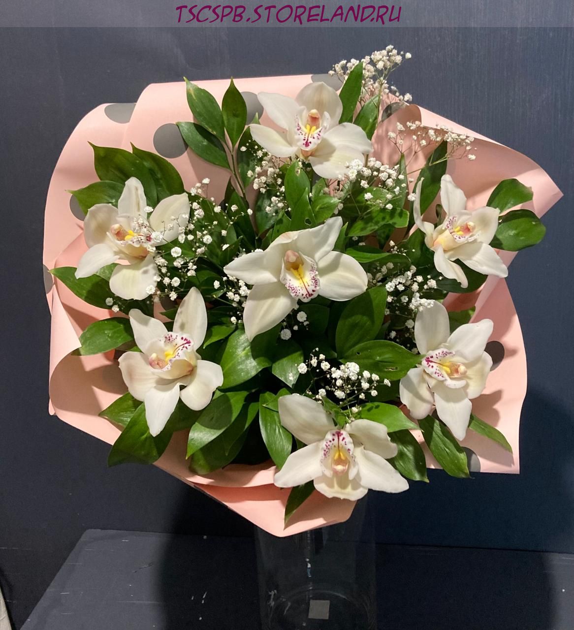 Роскошный букет из 7 орхидей с гипсофилой и зеленью в авторской упаковке. Идеальный подарок для любого повода. Быстрая доставка по Санкт‑Петербургу.