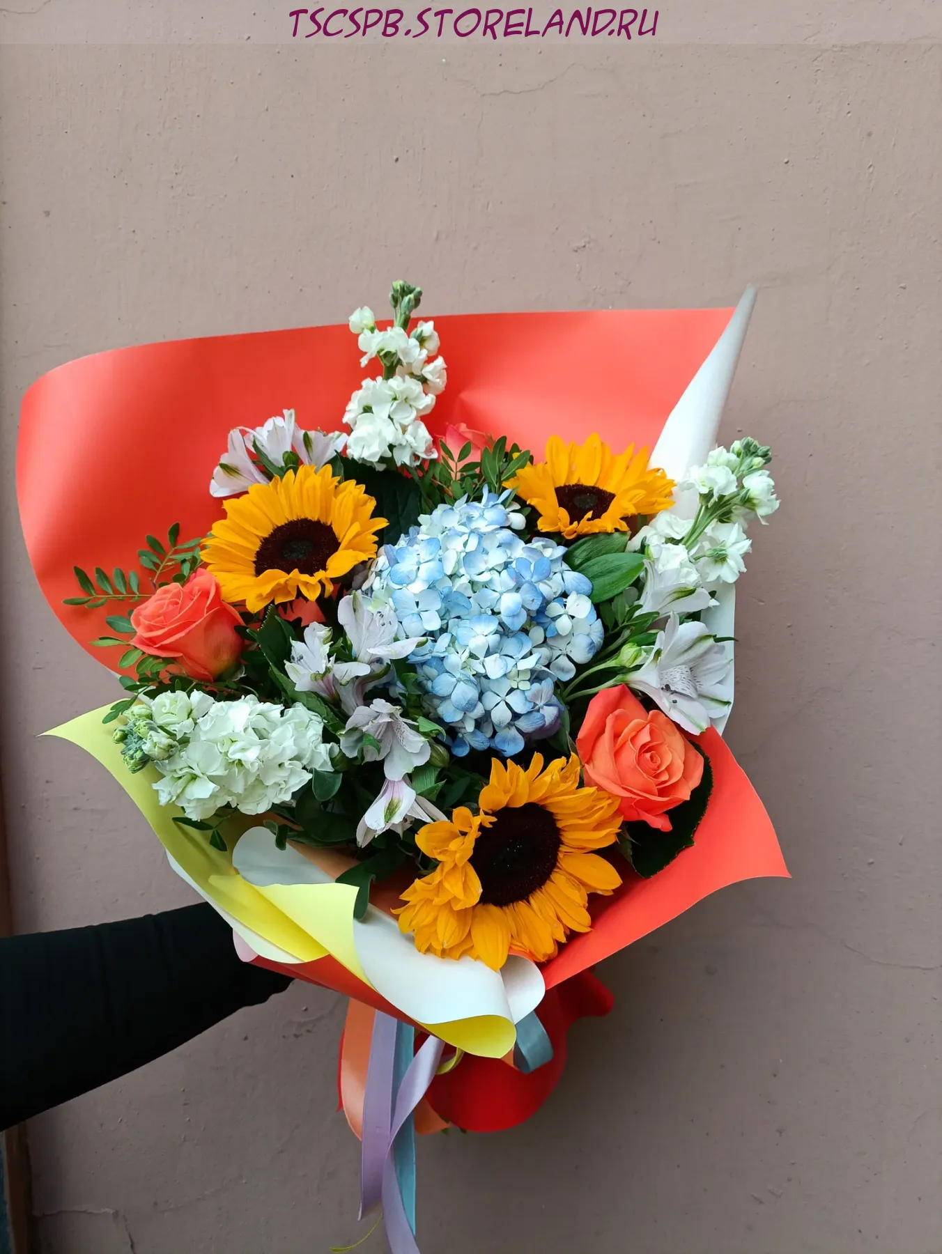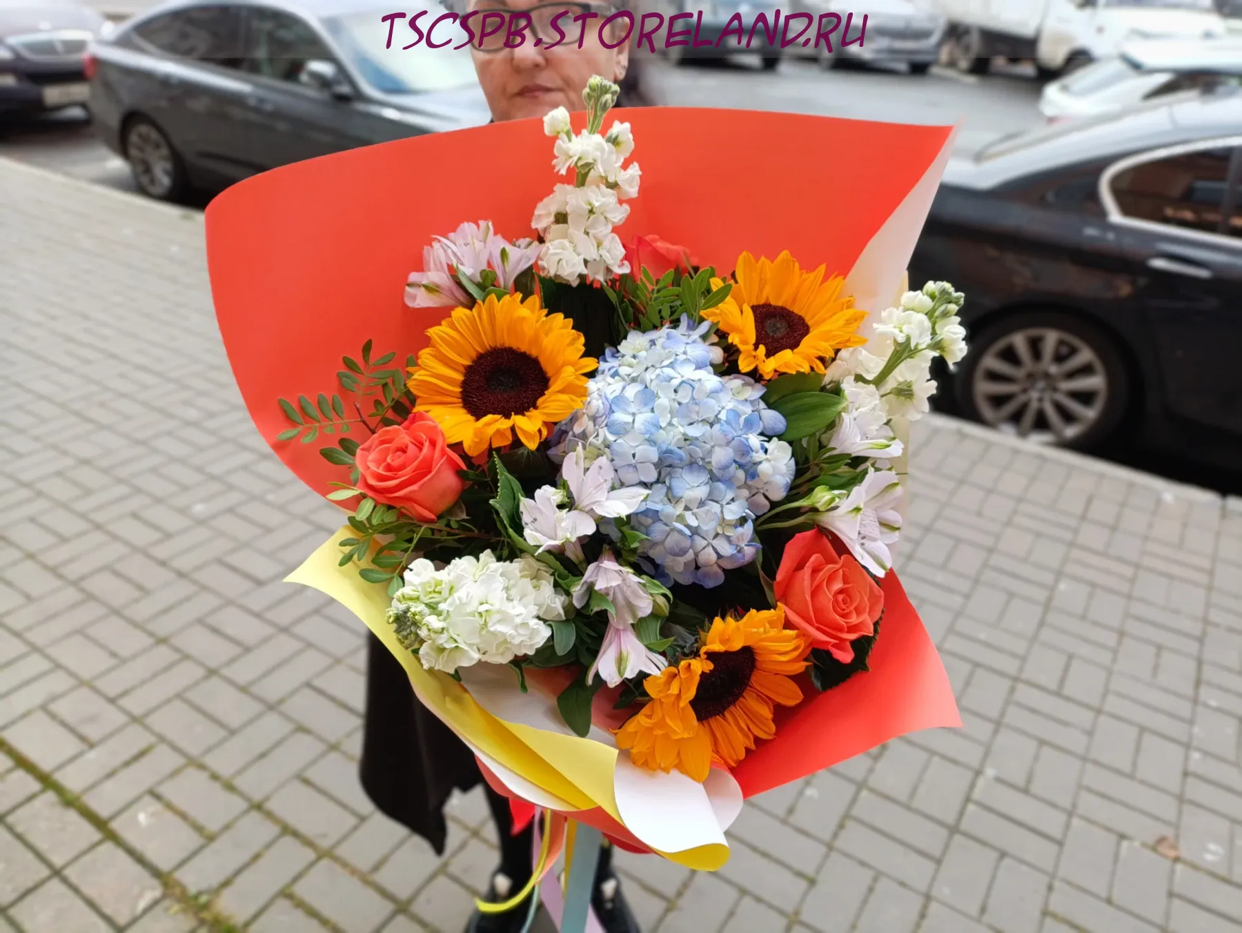 Букет «Контраст» — эффектный авторский букет с подсолнухом, розой и гортензией. Идеален для подарка и украшения интерьера. Закажите доставку цветов в Санкт‑Петербурге быстро и удобно.