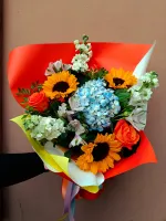 Букет "Контраст" — это взрыв эмоций в одном флаконе: солнечный подсолнух, ароматная маттиола, нежная альстромерия, благородная роза, пышная гортензия и изящная фисташка, аккуратно завернутые в авторскую упаковку. Этот букет — идеальное решение, когда нужно сказать «я думаю о тебе», «поздравляю» или просто поднять настроение без лишних слов. Почему выбирают «Контраст»? - Игра цвета и фактуры: яркий подсолнух сразу привлекает внимание, роза добавляет романтики, гортензия — объем и изысканность, маттиола — тонкий аромат, а альстромерия и фисташка продлевают эффект свежести. Такая композиция смотрится эффектно в интерьере и становится центром внимания. - Готовое решение для подарка: авторская упаковка делает букет презентабельным без дополнительной подготовки — дарите сразу и эффектно. - Экономит время и нервы: не нужно думать, какие цветы сочетаются — флористы уже создали идеальный баланс контраста и гармонии. - Повышает настроение и создает атмосферу: «Контраст» заряжает теплом, вызывает улыбки и делает любой день особенным. Кому подойдет? Для тех, кто ищет выразительный подарок на день рождения, юбилей, романтическую встречу или корпоративное событие; для тех, кто хочет украсить дом или офис и создать запоминающийся акцент. Букет "Контраст" — это не просто цветы, это мгновенная радость, уверенная эстетика и решение «что подарить» в одном роскошном букете. Хотите купить букет "Контраст"? Оформите заказ с доставкой цветов прямо сейчас и подарите эмоции, которые запомнятся надолго.