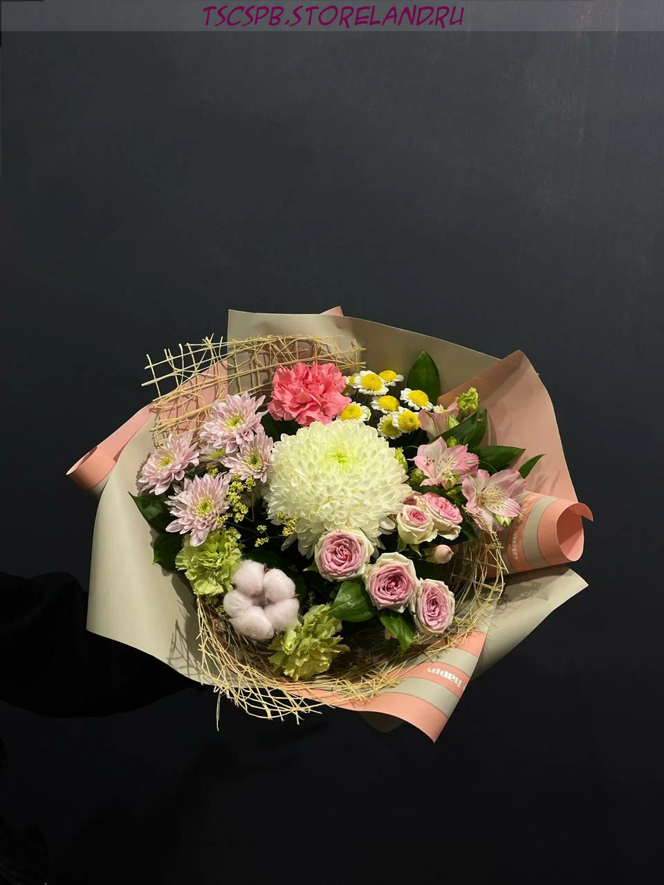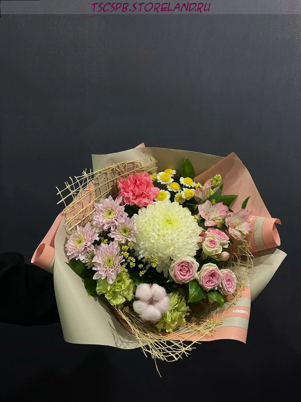 - Хлопок (1 шт) — добавляет нотку уютности и естественности, подчеркивая индивидуальность букета.