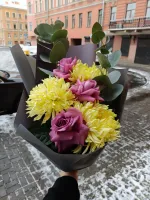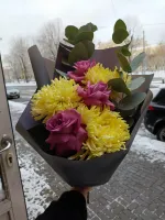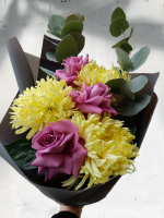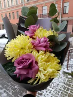 Букет "Оттенки серого" — это изысканное сочетание сиреневых роз и желтых хризантем, которое добавляет загадочности и стиля. Упаковка на выбор и свежесть цветов гарантируют радость каждый день. Закажите сейчас!