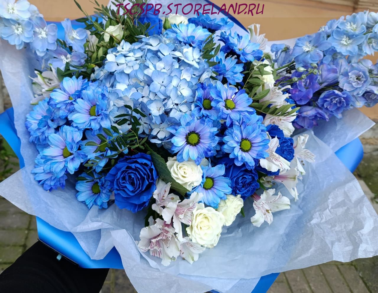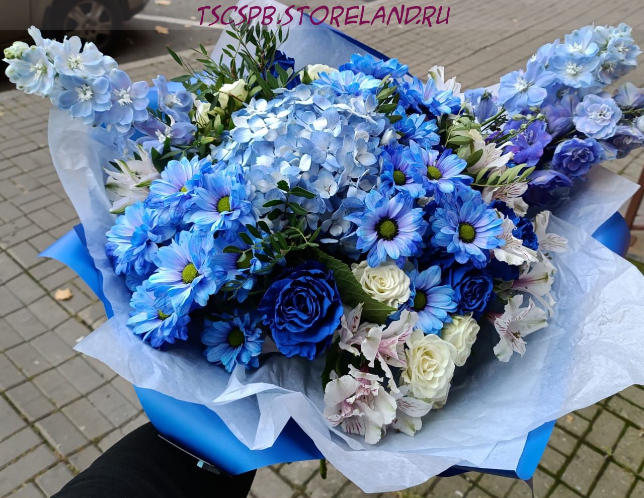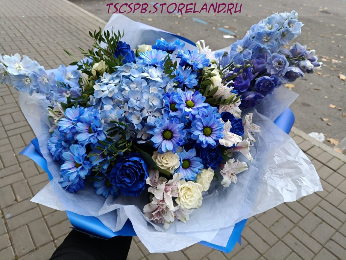 Букет «Синий туман» — авторская композиция из роз, гортензии и альстромерии в стильной синей упаковке. Идеальный подарок для романтического повода. Закажите с доставкой по Санкт‑Петербургу