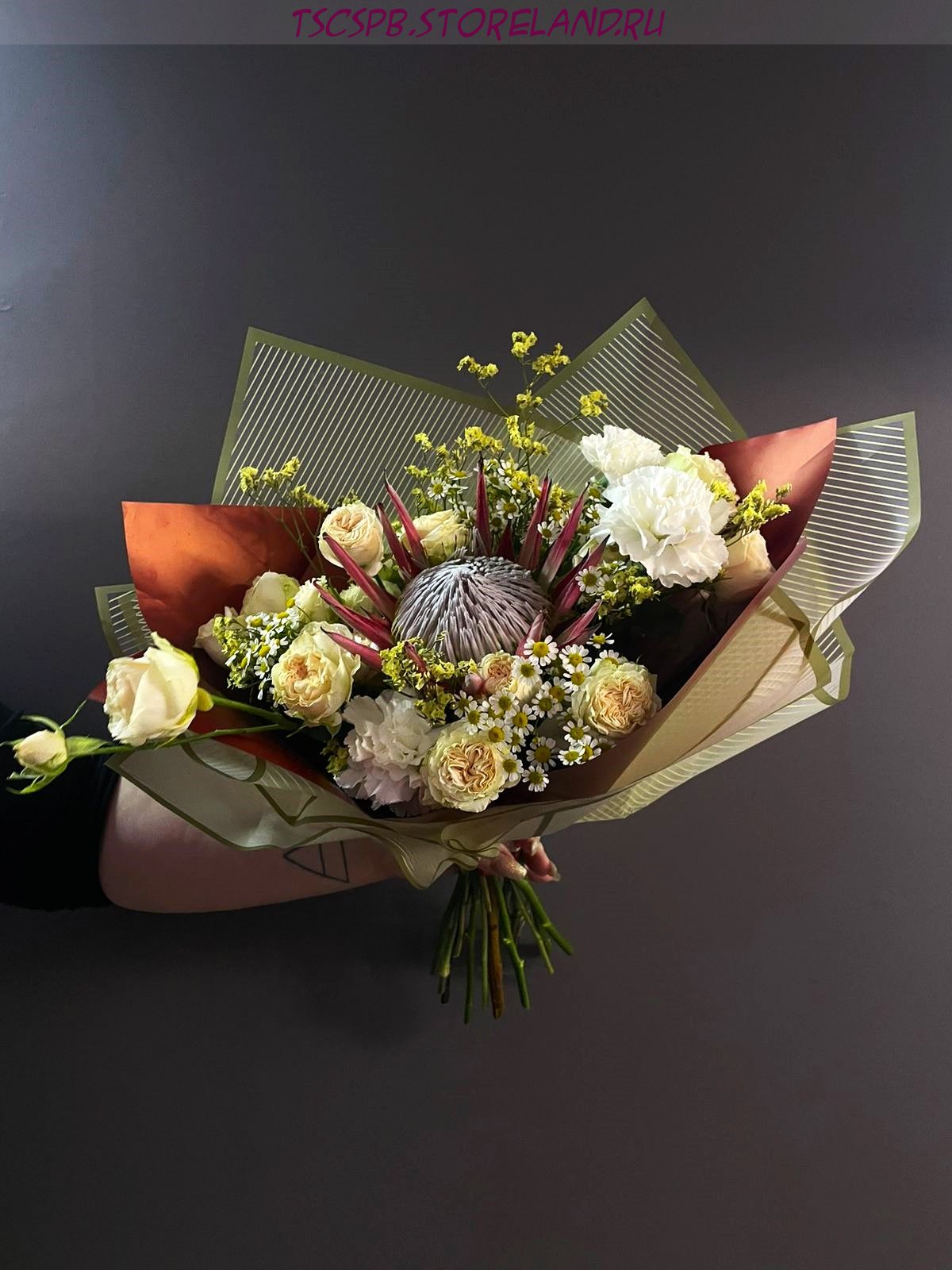 Букет «Верона» — нежная авторская композиция с протеей, кустовыми розами и диантусами. Подходит для романтического подарка, благодарности и торжественных событий. Доставка свежих цветов по Санкт‑Петербургу.