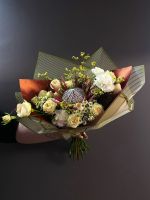 - Изысканная композиция: Букет состоит из 1 протеи, 6 кустовых роз, 3 одноголовых диантусов, 3 танацетума и 2 лимониума, что делает его не только визуально привлекательным, но и невероятно уникальным. Каждый цветок был тщательно отобран, чтобы создать гармонию и завершенность.
